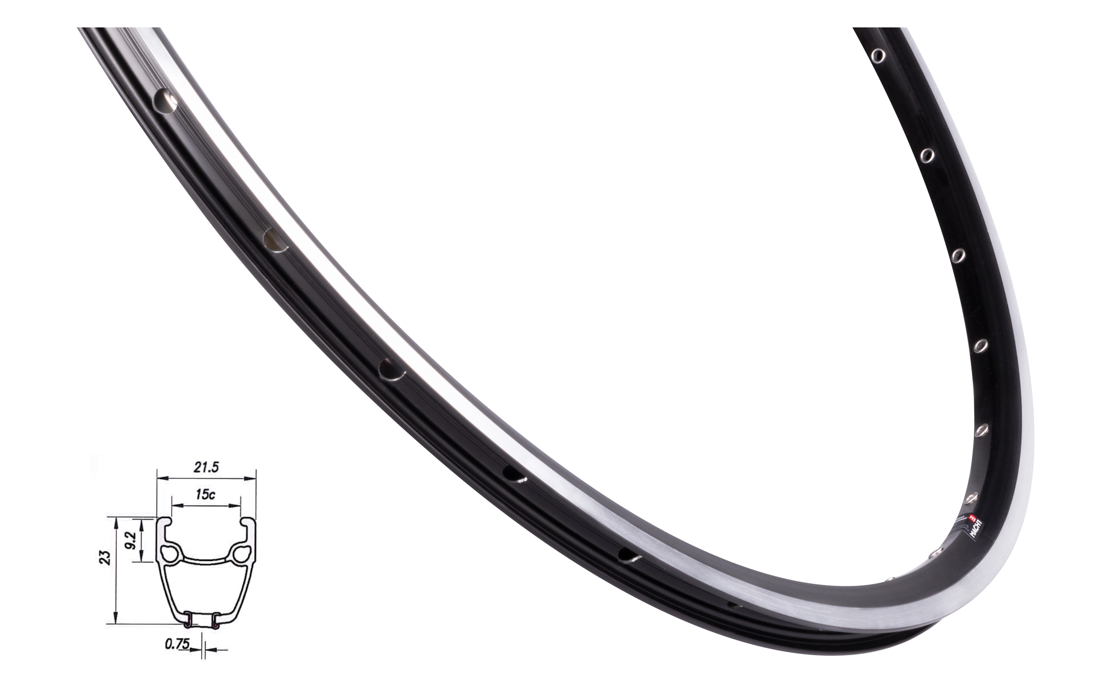 700C, dvojstěnný ráfek, jednoduchý nýt výška ráfku: 23 mmotvor pro ventilek: 6,5 mmERD (efektivní průměr ráfku): 591 mmpro silniční brzdy, broušený bokmateriál: slitina hliníku 6063T6hmotnost: 550 g